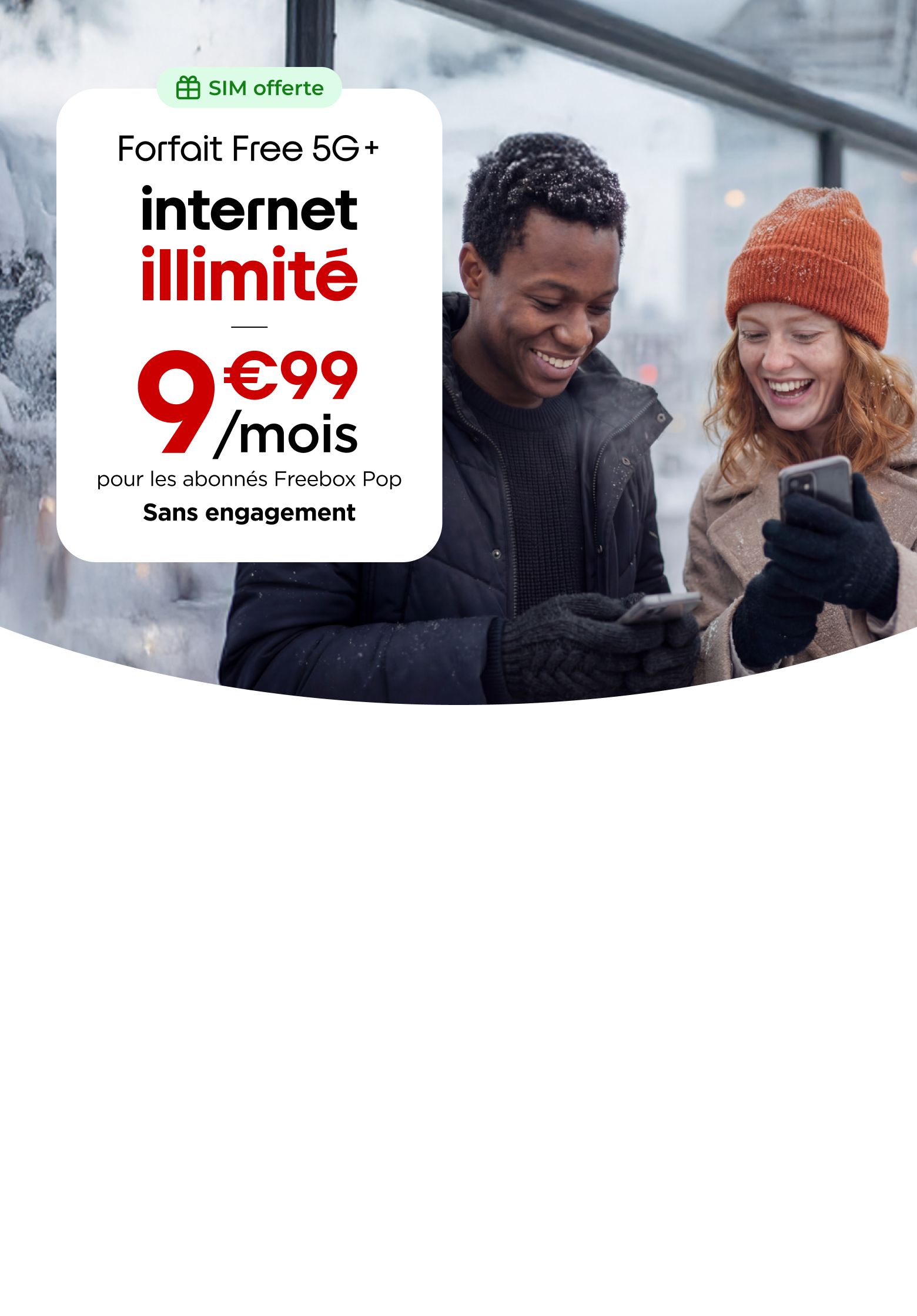 Pour les abonnés Freebox Pop : 9.99€/mois, soit une réduction de 10€/mois, valable sur 1 seul Forfait Free 5G+ ; et 9.99€/mois pendant 1 an, soit une réduction de 10€/mois, puis 15.99€/mois, soit une réduction de 4€/mois, dans la limite de 3 Forfaits Free 5G+ souscrits après le 01/10/2024 et après l’offre Freebox.